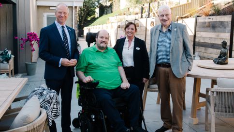 His Excellency visited Jersey Cheshire Home on the 7th October 2025 to officially open the newly refurbished garden which has doubled the outdoor space available for residents and their families to enjoy. Photo L-R: His Excellency, Stephen Mahoney (resident), Donna Abel, Chief Executive Officer, and James Hopley MBE, Chairman.